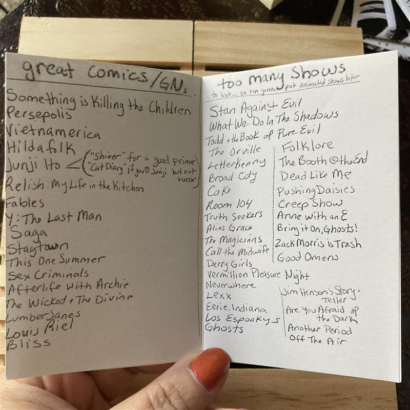 As many recommendations for movies, books, comics, and shows that I can fit into 6 tiny pages.